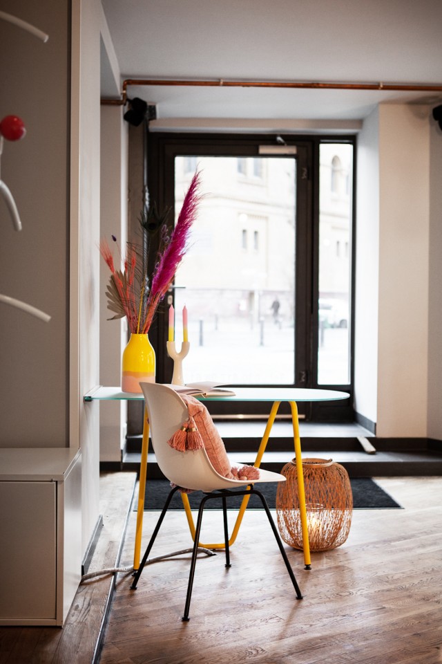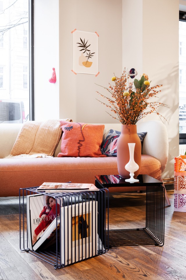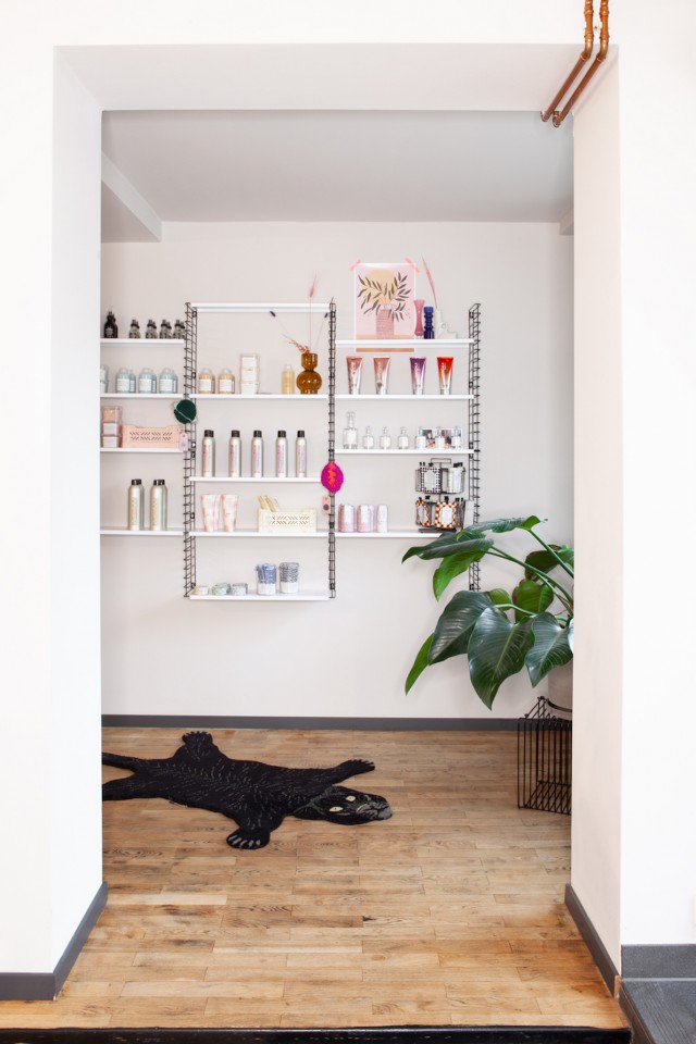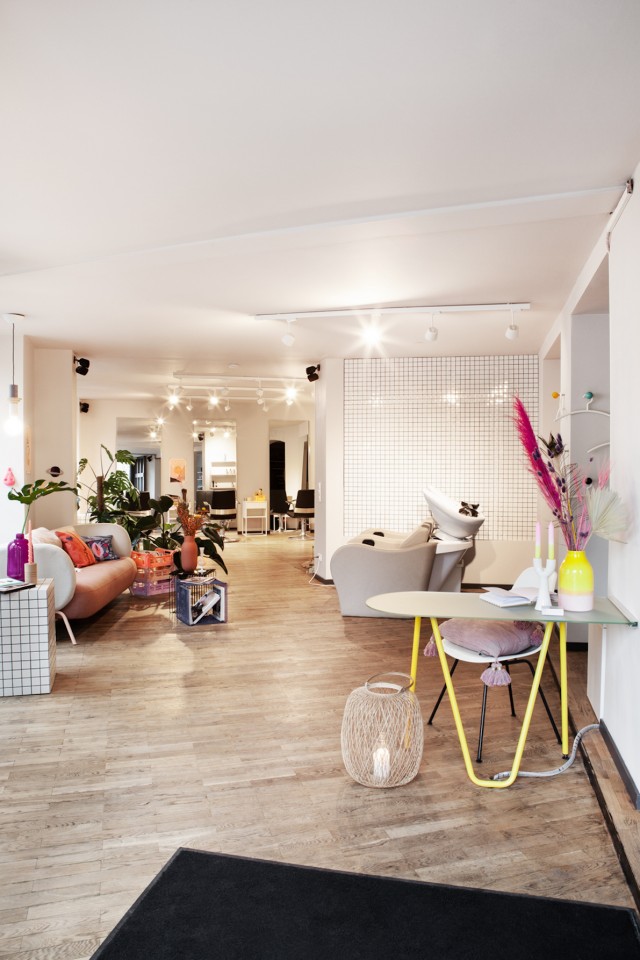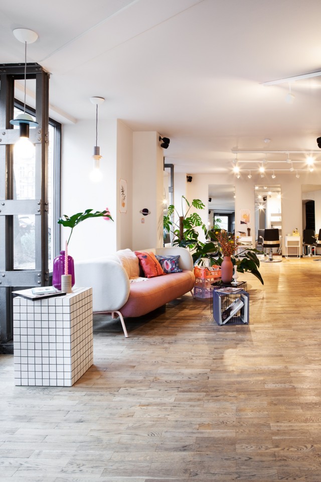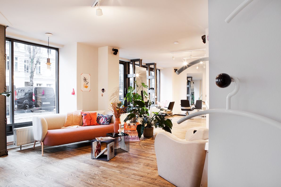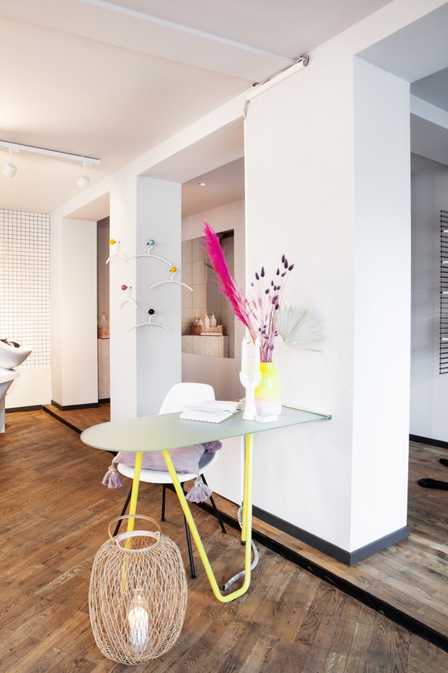 Ontdek verder binnen een prachtig ingerichte schoonheidssalon, uitgerust met strakke zwarte kappersstoelen, houten vloeren en netjes georganiseerde cosmetische producten op minimalistische planken, die een serene en professionele sfeer creëren. Elke ruimte heeft een consistent thema van chique moderniteit, waaronder een woonkamer met een gezellige perzikkleurige bank, levendige kussens en een reeks decoratieve elementen zoals een stijlvolle gele tafel met decoratieve veren. Dit pand belooft niet alleen een dynamische en flexibele zakelijke mogelijkheid, maar biedt ook een rustige maar stimulerende omgeving die zowel klanten als werknemers zal aanspreken.
