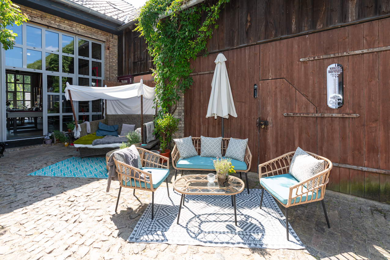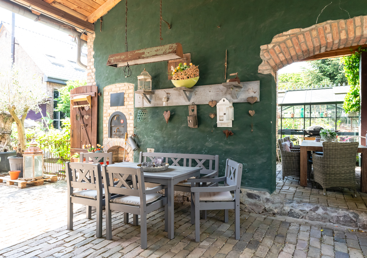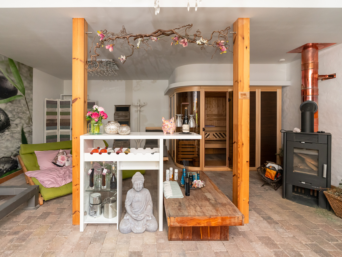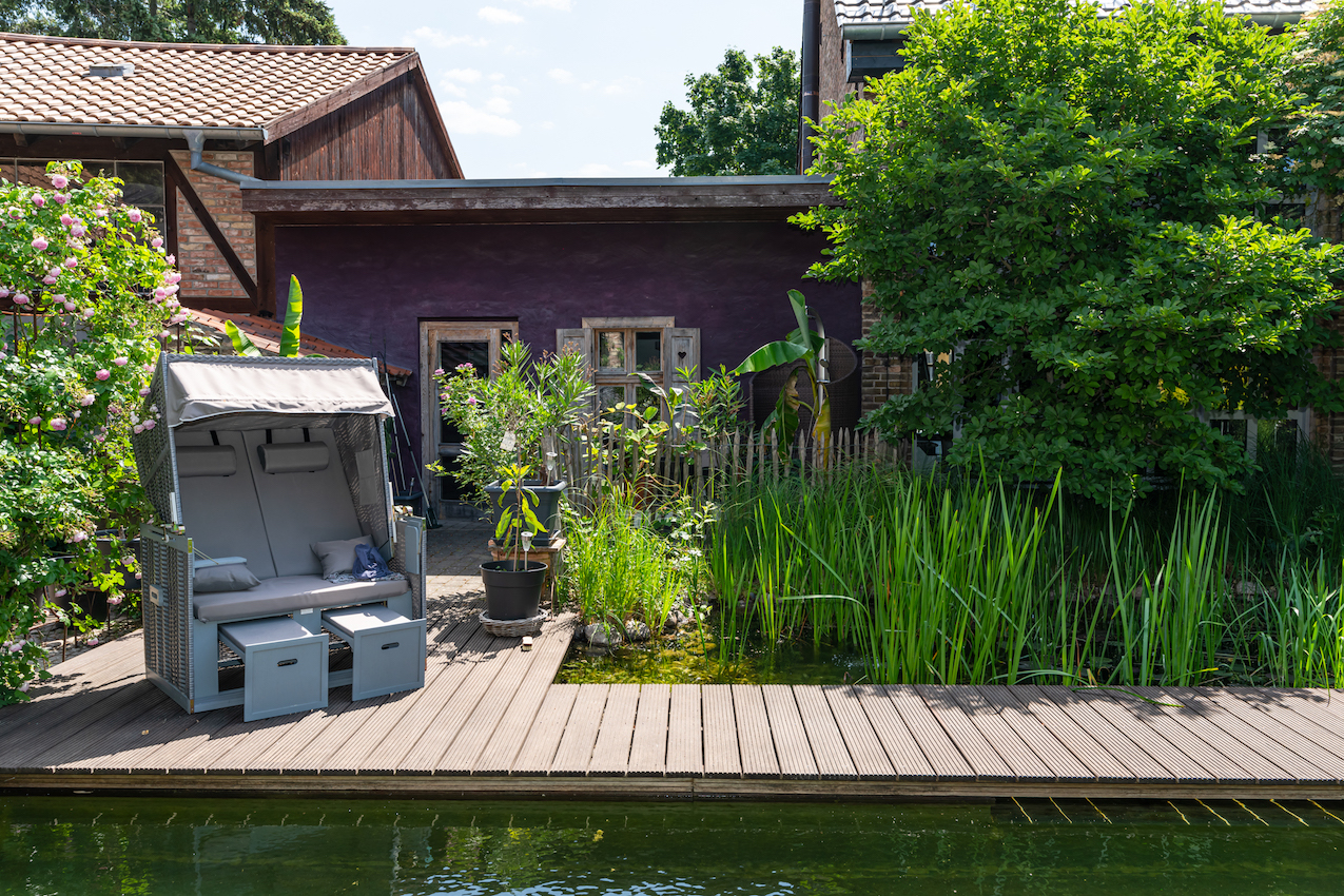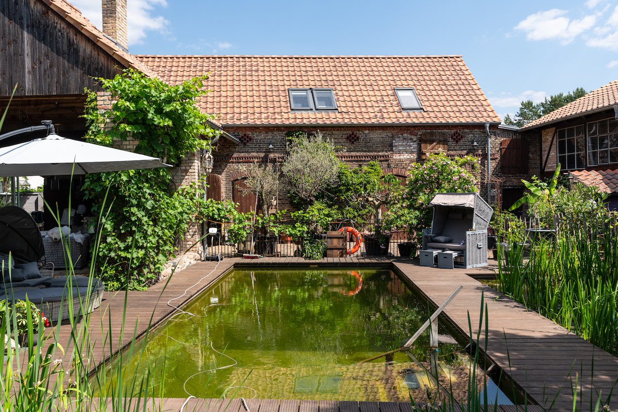 Deze woning ligt in een volledig omheinde tuin en biedt een serene sfeer. De tuin heeft een natuurlijk zwembad, een zomerkeuken en een sauna.