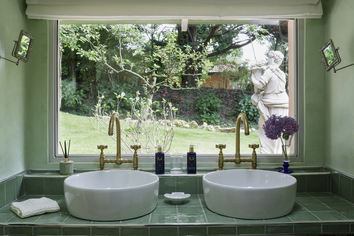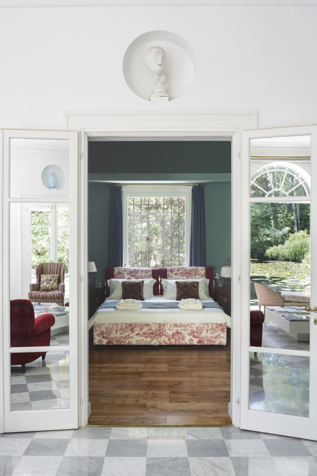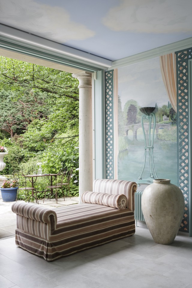 Villa Padiglione is de andere ziel van het meer, leunend tegen een trap die zachtjes afdaalt in het water, te midden van vazen en stenen ballen die de randen sieren. Het paviljoen bestaat uit een prachtige woonkamer met fresco's in de kleuren van de eeuwige zomer. Uitgerust met een open haard en ramen die uitkomen op de patio voor het meer waar je kunt genieten van lunches en diners of gewoon de lotusbloemen, waterlelies en veelkleurige eenden en de natuur rondom kunt observeren. De kamers, met zachte tinten en warm hout en een grote bibliotheek, maken het een elegant toevluchtsoord waar je kunt genieten van het schouwspel van de fruitbomen, bloemen en beelden die het huis omhullen als een zachte bescherming. Beide kamers hebben een eenvoudige, lichte badkamer, met wastafels voor grote ramen die bloemen en beelden omlijsten. De villa heeft twee slaapkamers, een in Pruisisch groen en een in roze, met twee grootse, gedenkwaardige badkamers. De badkamer in gevlekt zwart marmer heeft zelfs een kleine sterrenhemel.