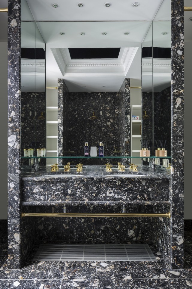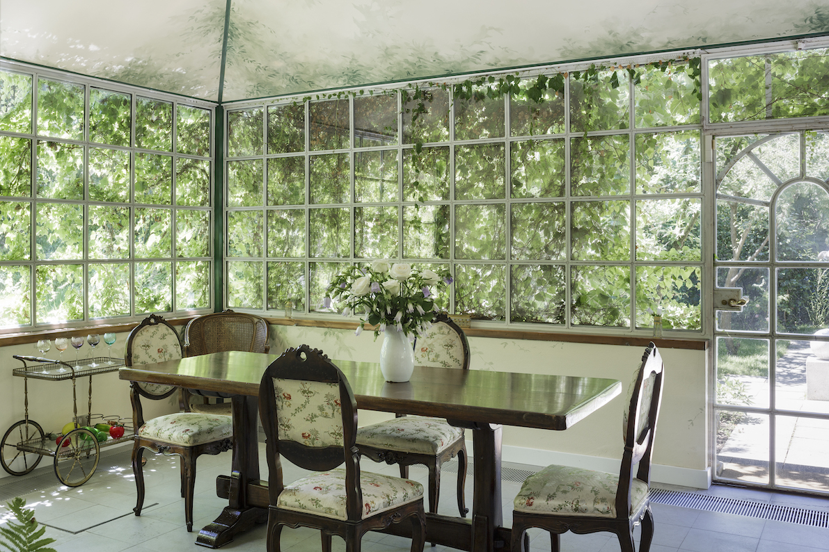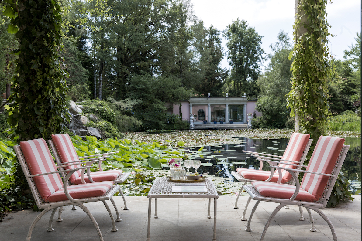Het andere, een neoklassiek paviljoen, heeft grote ramen die uitkomen op een trap die je het meer in begeleidt.