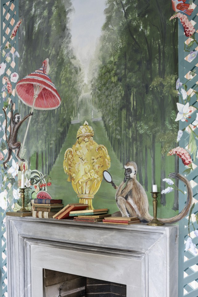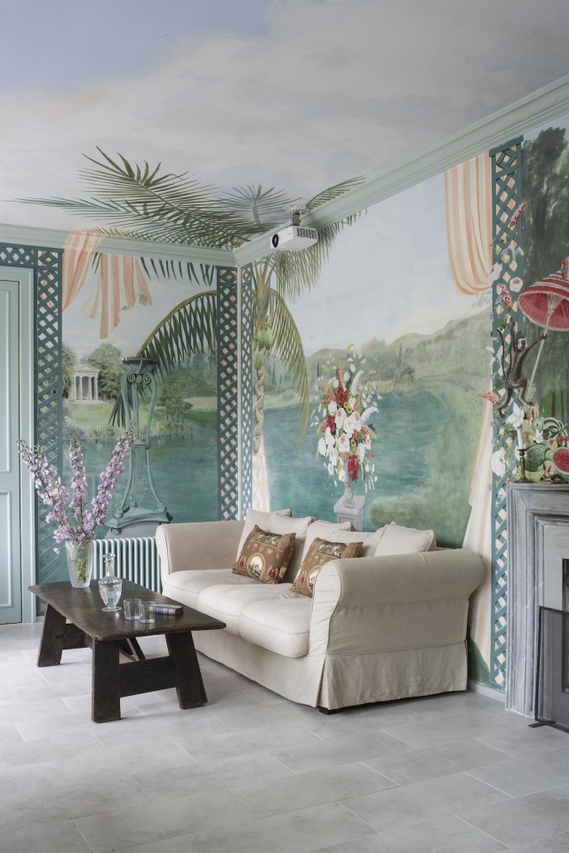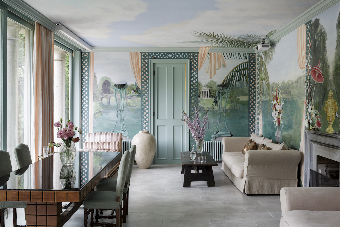 een heeft een achthoekige plattegrond, met openslaande deuren die het water en de beelden die de randen sieren vanuit de woonkamer omlijsten.