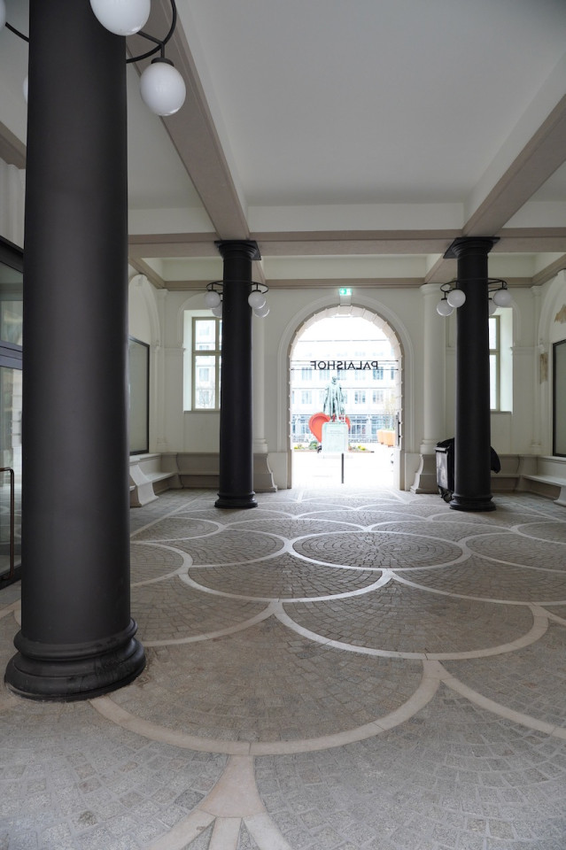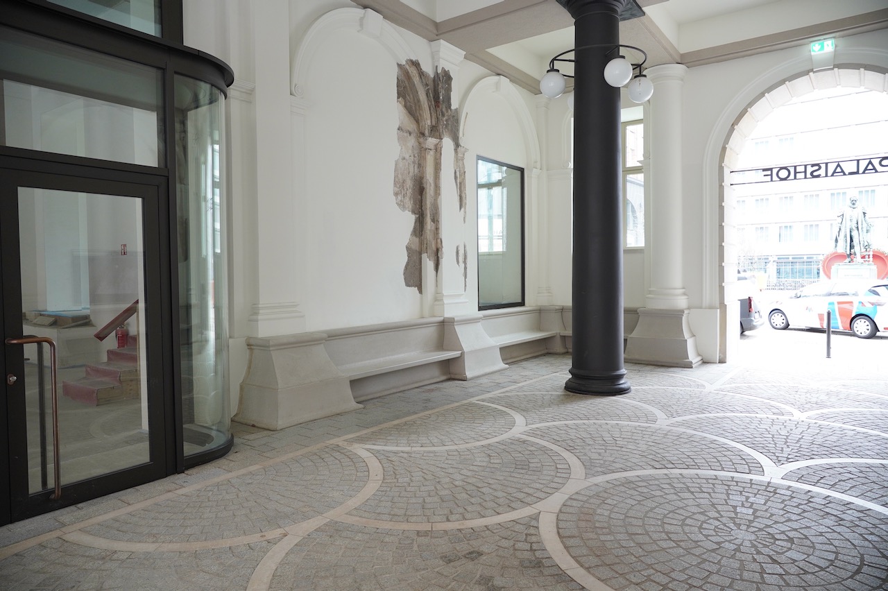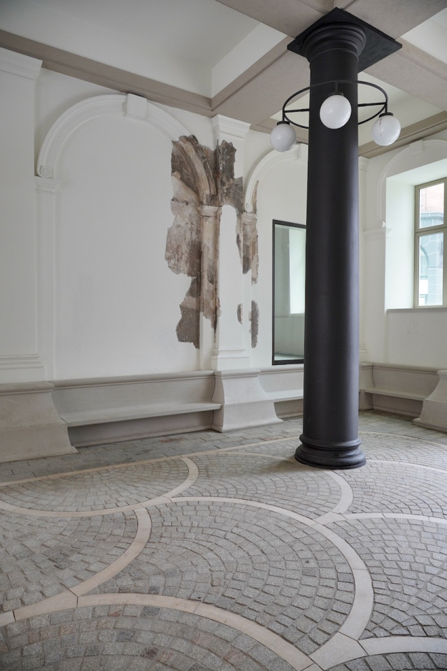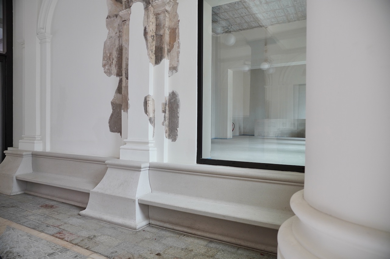 Binnen blijft het pand indruk maken met elegante gangen met zwarte zuilen, ingewikkelde stenen vloeren en klassieke architectonische details. Een prachtige mozaïekvloer loopt door de gangen en leidt naar verschillende kamers, waaronder een moderne kunstgalerie met afbladderende schilderijen op maagdelijk witte muren, wat een dramatische maar intieme sfeer creëert. Grote omlijste ramen en glazen deuren zorgen voor natuurlijk licht in de ruimtes, waardoor elke kamer luchtig en gastvrij aanvoelt. Voor degenen die houden van historische betekenis vermengd met moderne esthetiek, biedt dit pand een ongeëvenaarde woonervaring in een stedelijke omgeving die zowel vredig als architectonisch fascinerend is.