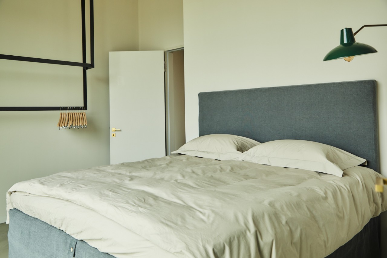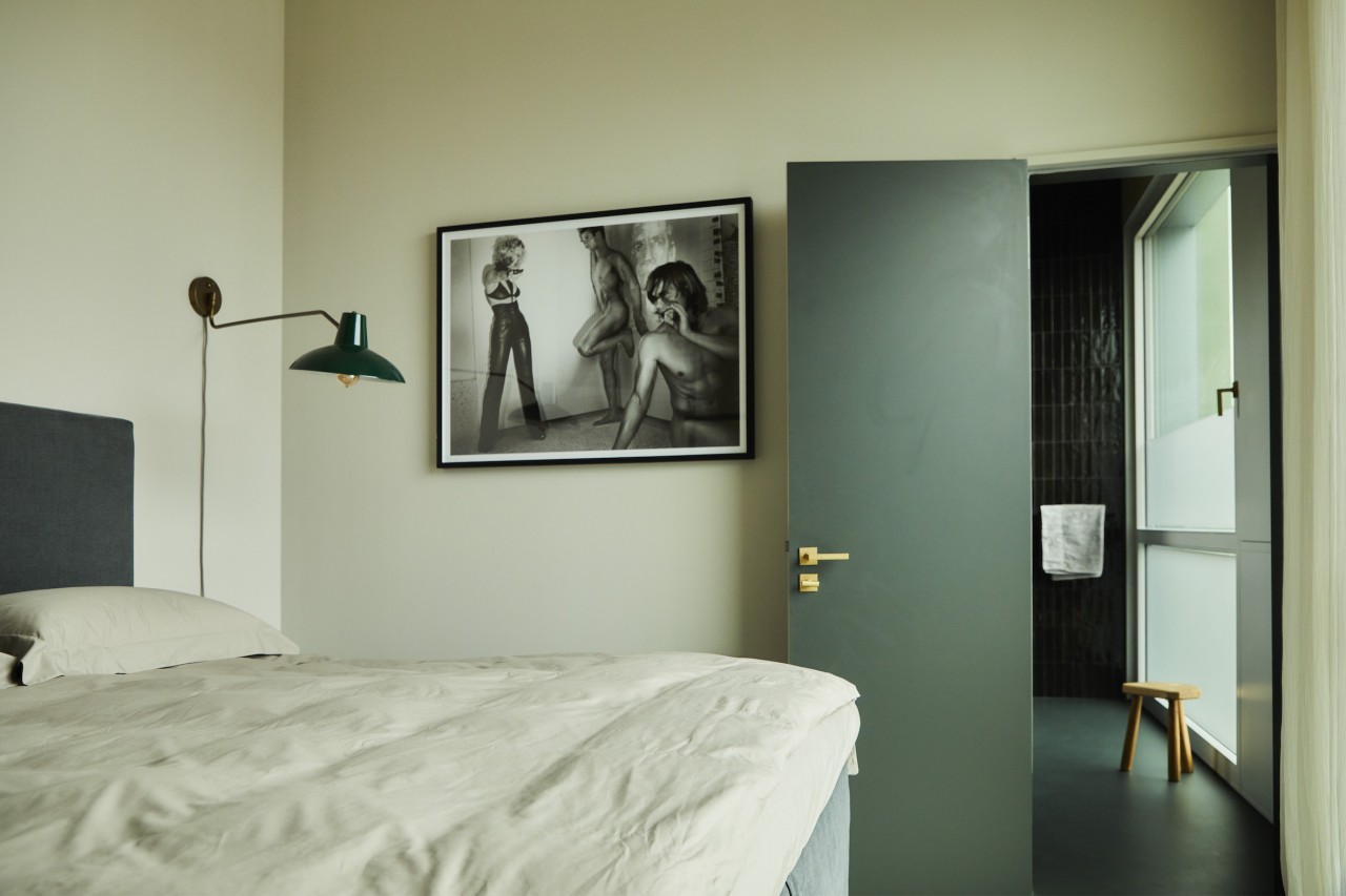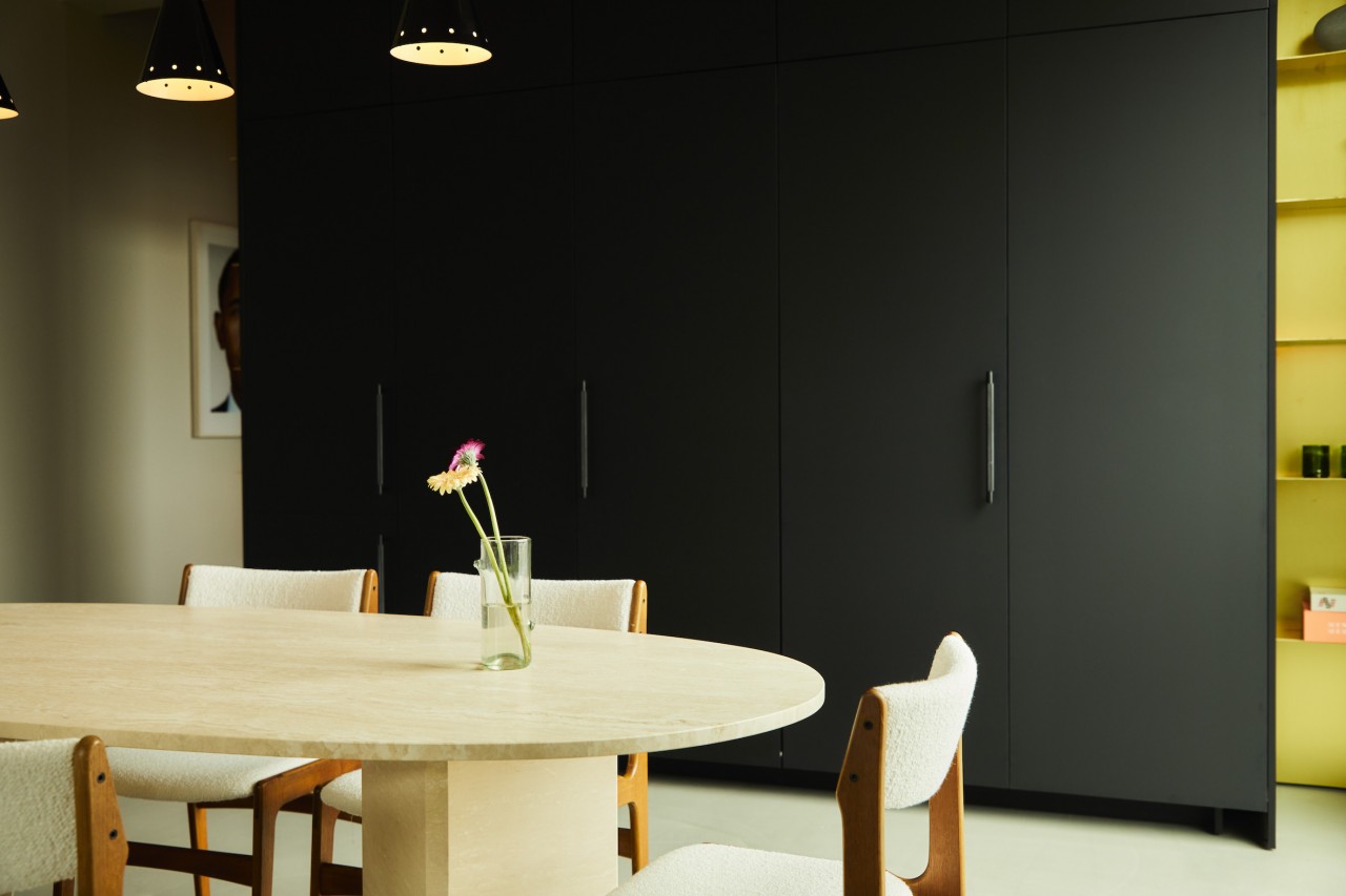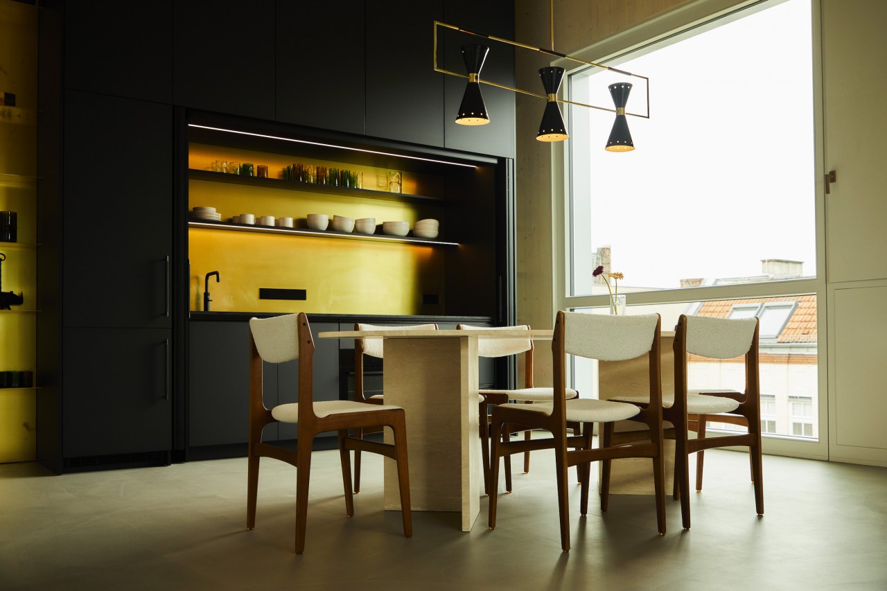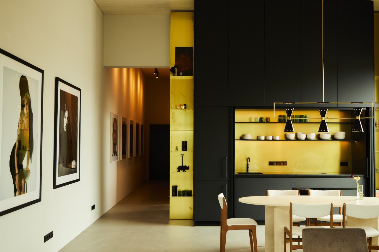 De inrichting van dit penthouse bestaat uit vintage meubilair uit de jaren 50, 60 en 70 - hoogtepunten zijn de scandinavische stoelen uit het midden van de eeuw en de op maat gemaakte travertijnen eettafel. De keuken, met zijn opvallende gouden wand, kan elegant worden verborgen achter schuifdeuren. De aardse, lichte beiges en grijzen worden afgerond door een donker flessengroen en matzwart. De originele fragmenten uit de fotoserie "Close Up" van Martin Schller, die prominent in de gang en woonkamer zijn geplaatst, geven de ruimte een galeristisch gevoel - als een intieme, privé kunsttentoonstelling boven de daken van Berlijn.