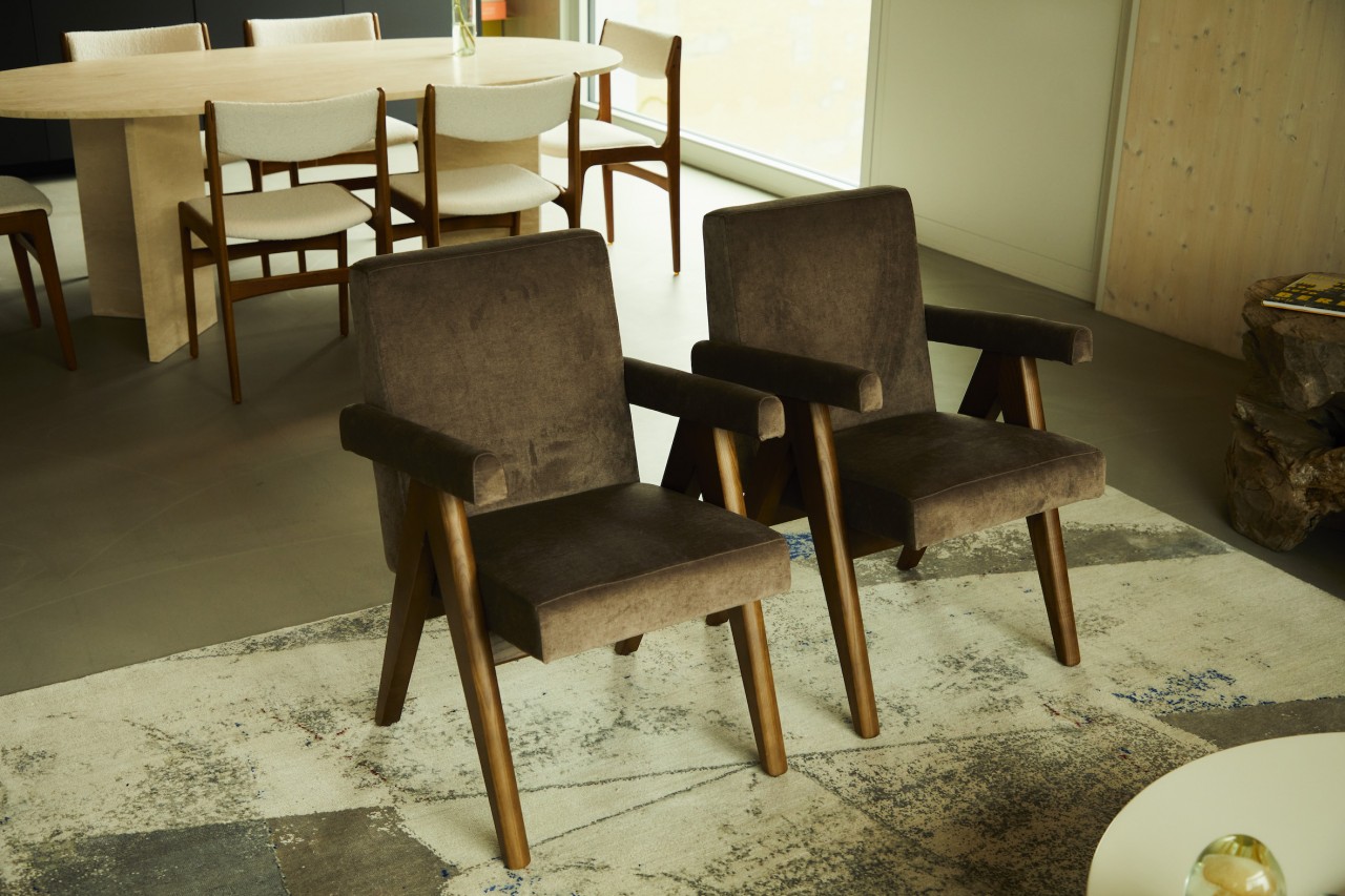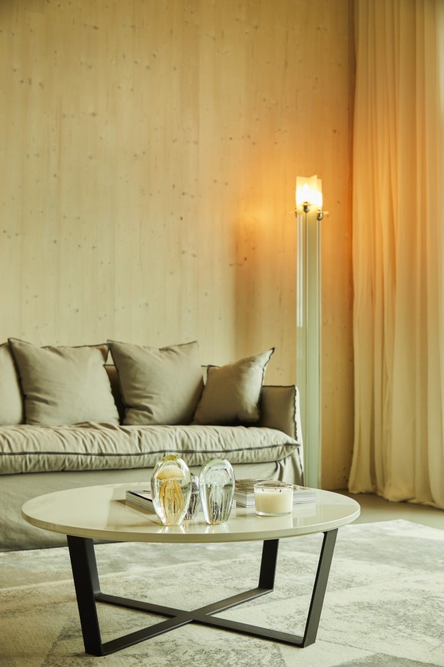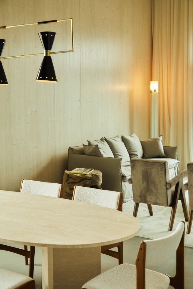 Door het sterke karakter van de constructie heeft dit penthouse een interessante mix van materialen en texturen: houten muren ontmoeten beton, gewichtloze linnen gordijnen op gepatineerd leer en luxe vintage bouclé op kalksteen.
