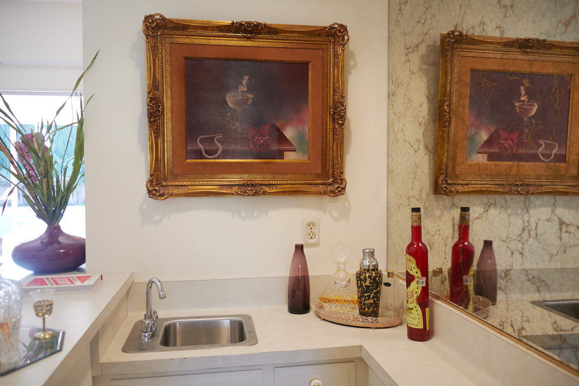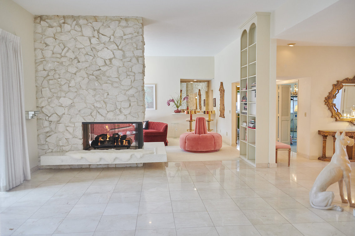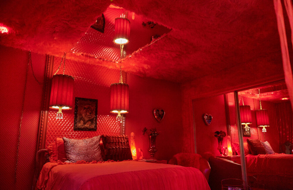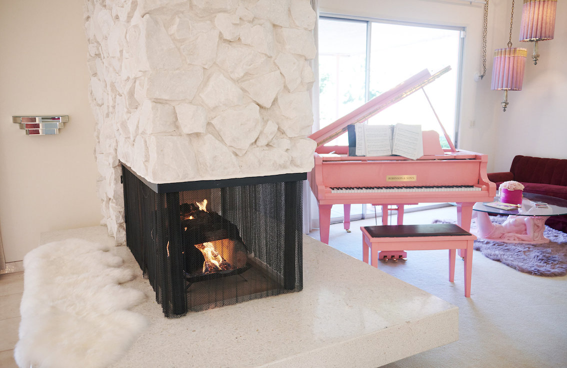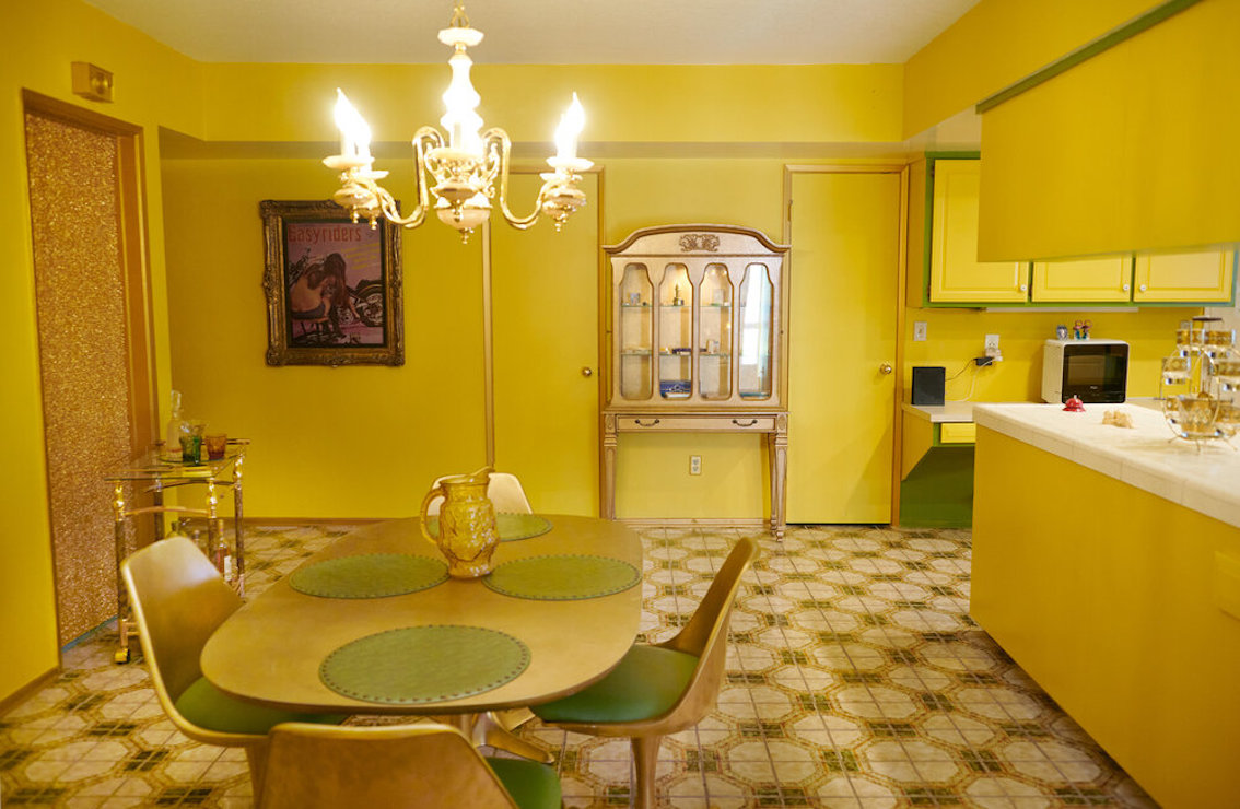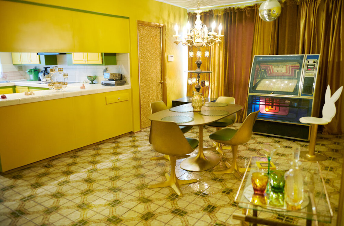 De woonkamer heeft een grote grijs/witte stenen gashaard en een natte bar. Vintage keukentegels en een tulpvormige eetset. Vintage kroonluchters en kristallen knoppen door het hele huis, 2 jack & jill badkamers, waarvan een met funky mylar foliebehang. De grote slaapkamer heeft een draaibaar bed en de grote badkamer heeft een hemels verzonken bad en roze imitatiebont van vloer tot plafond.
