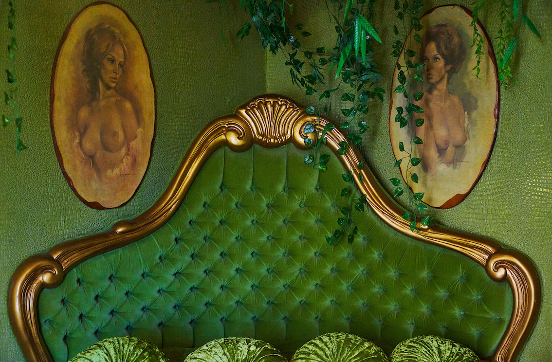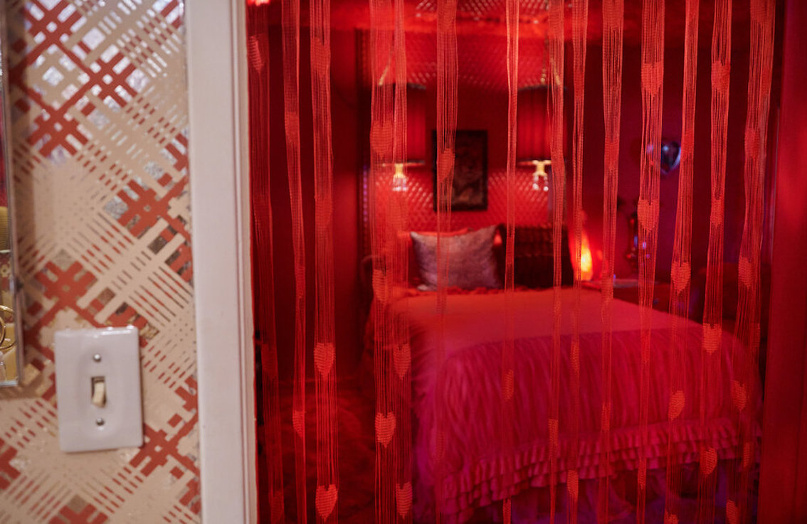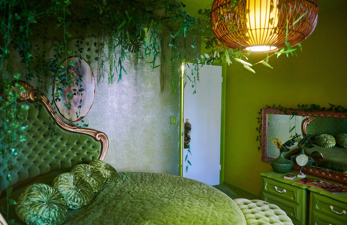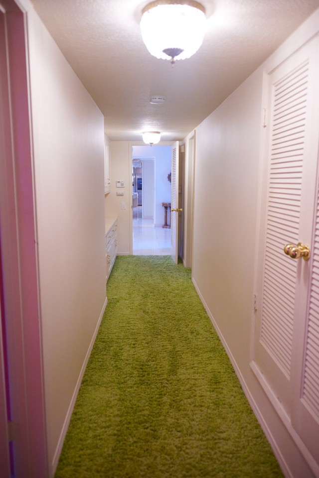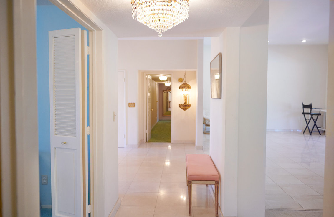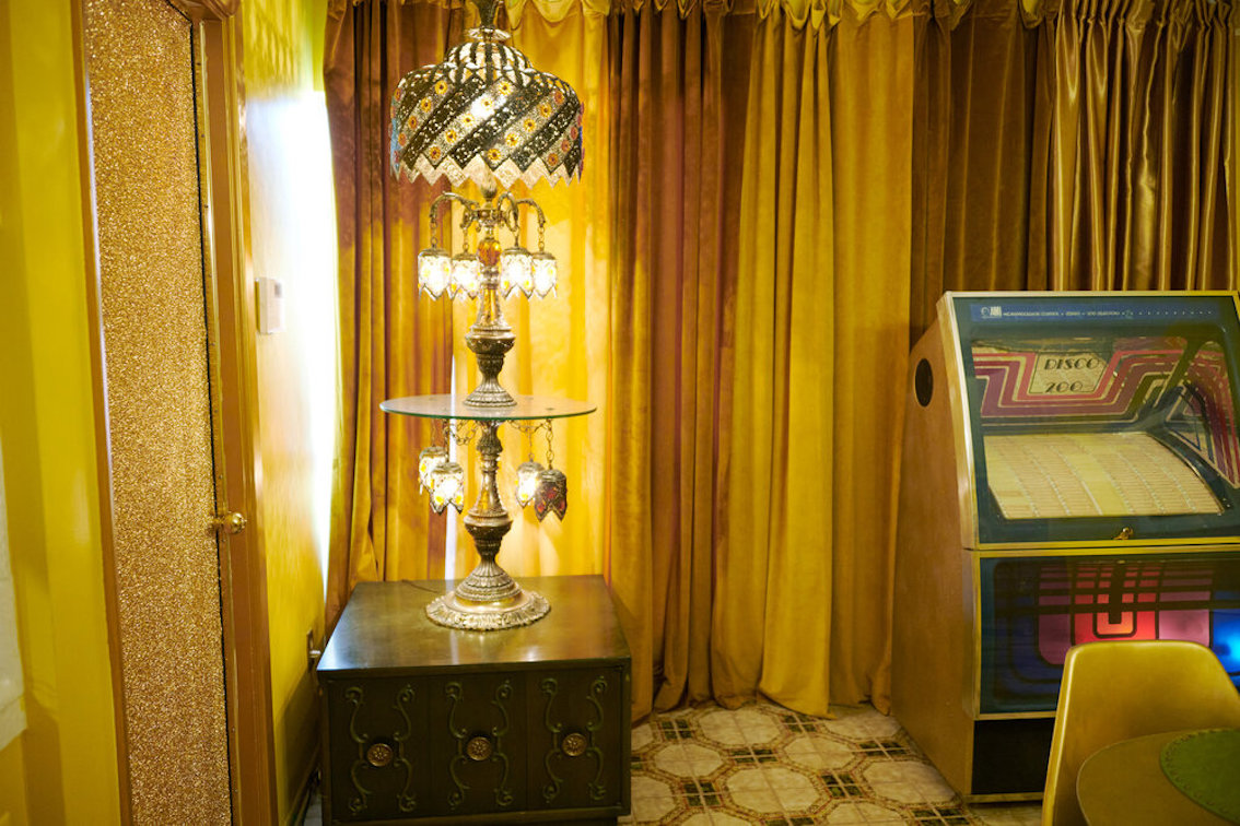 De woonkamer heeft een grote grijs/witte stenen gashaard en een natte bar. Vintage keukentegels en een tulpvormige eetset. Vintage kroonluchters en kristallen knoppen door het hele huis, 2 jack & jill badkamers, waarvan een met funky mylar foliebehang. De grote slaapkamer heeft een draaibaar bed en de grote badkamer heeft een hemels verzonken bad en roze imitatiebont van vloer tot plafond.