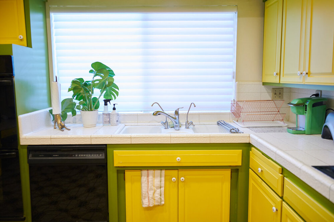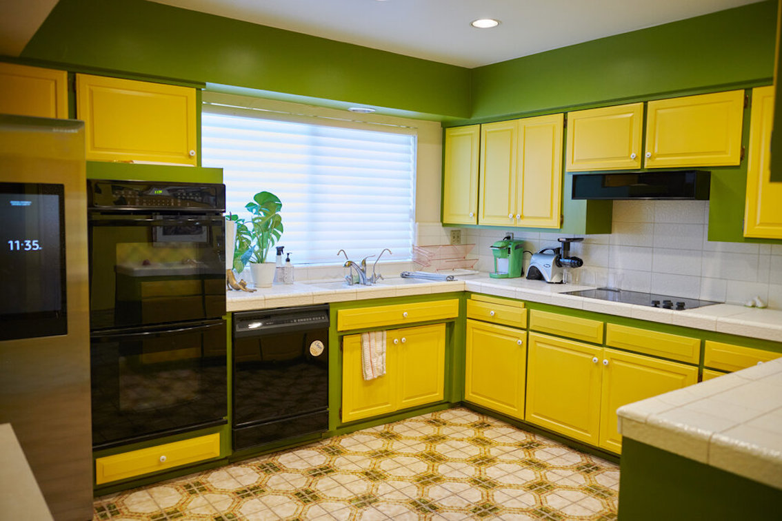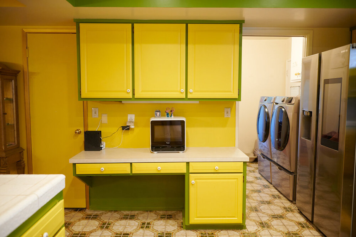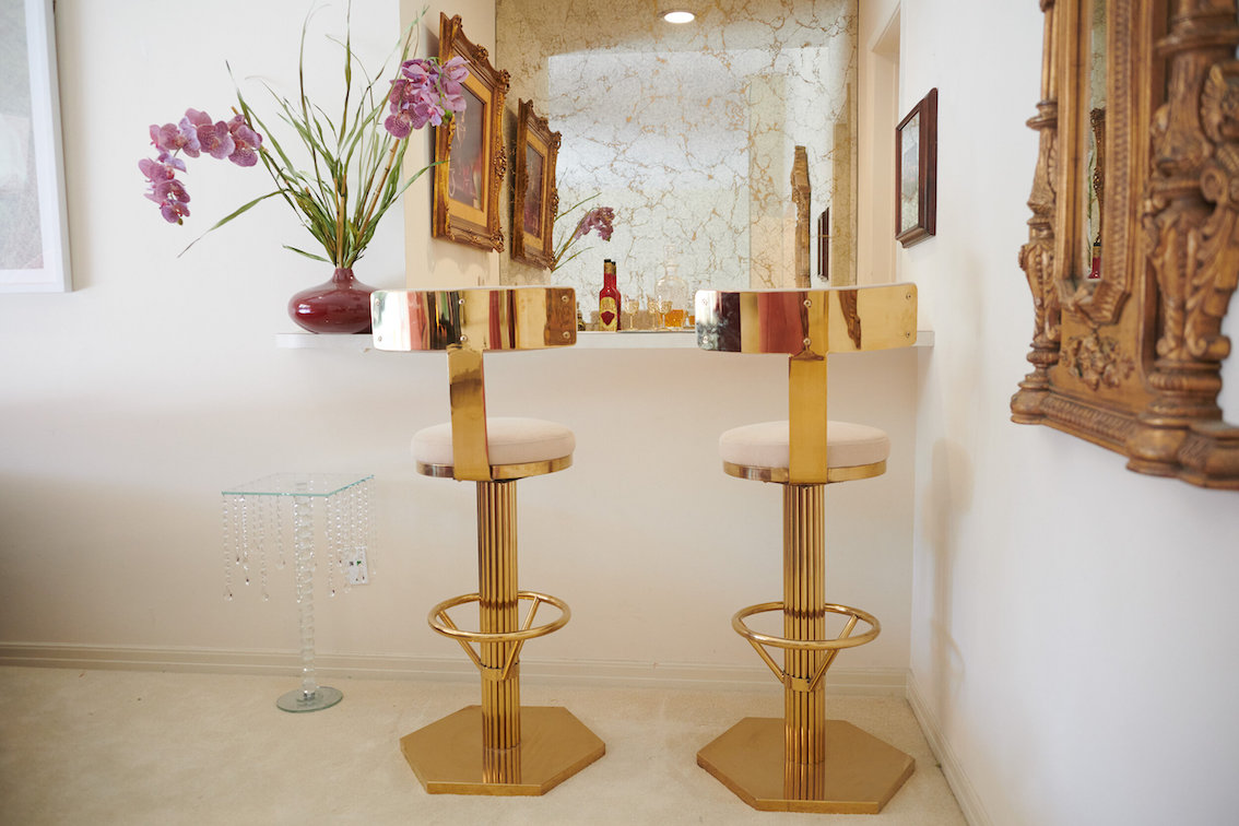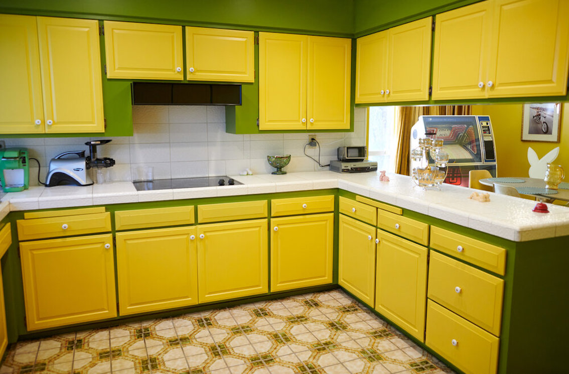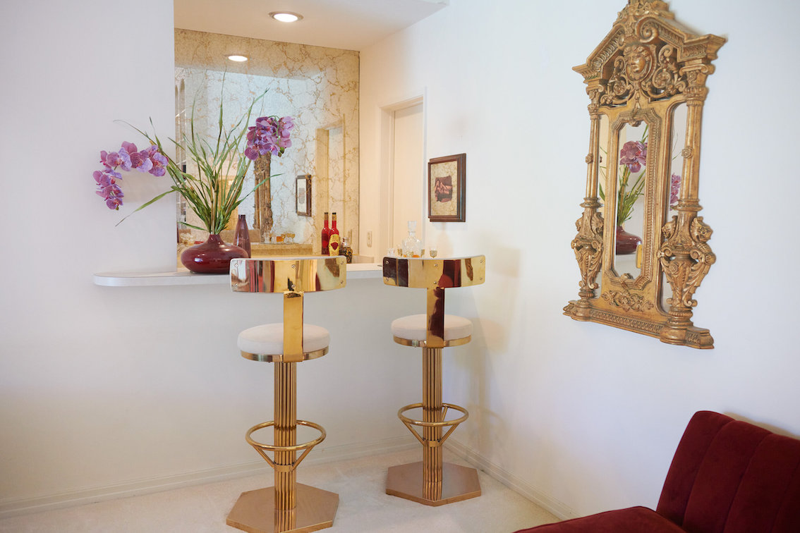 De woonkamer heeft een grote grijs/witte stenen gashaard en een natte bar. Vintage keukentegels en een tulpvormige eetset. Vintage kroonluchters en kristallen knoppen door het hele huis, 2 jack & jill badkamers, waarvan een met funky mylar foliebehang. De grote slaapkamer heeft een draaibaar bed en de grote badkamer heeft een hemels verzonken bad en roze imitatiebont van vloer tot plafond.