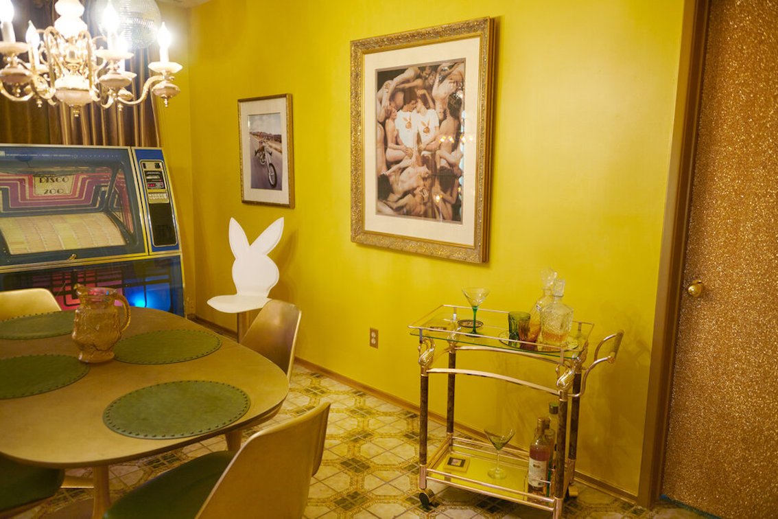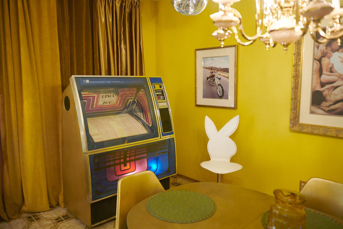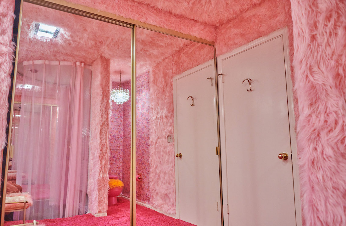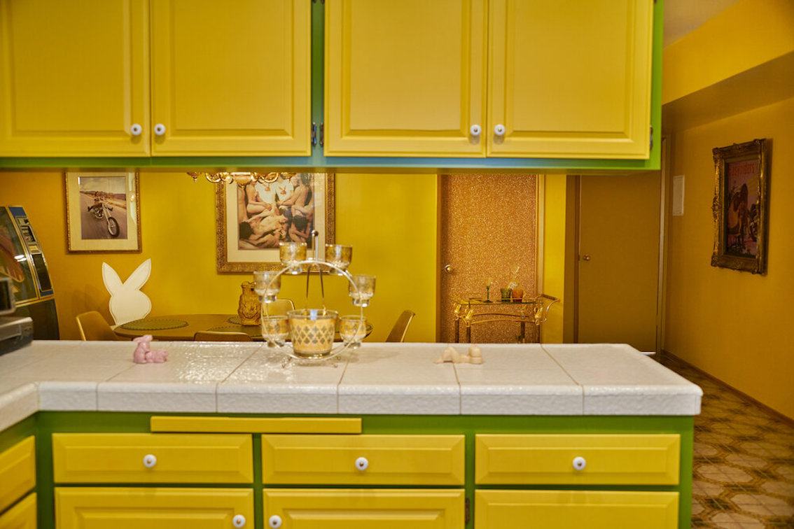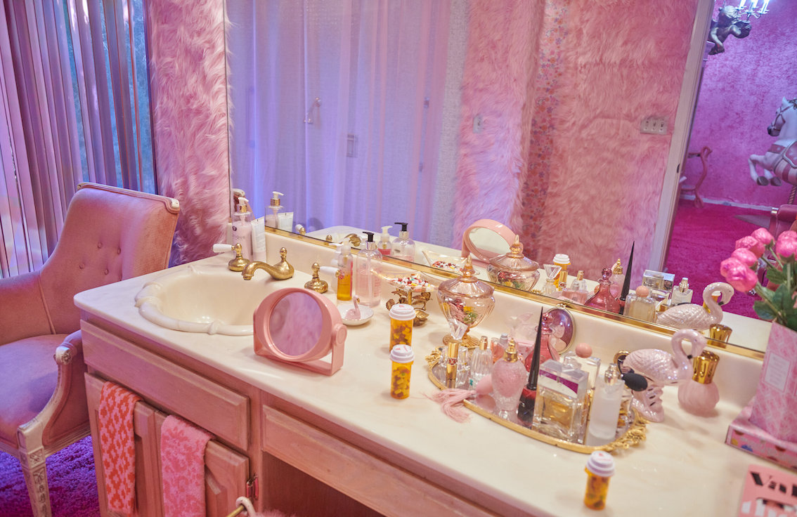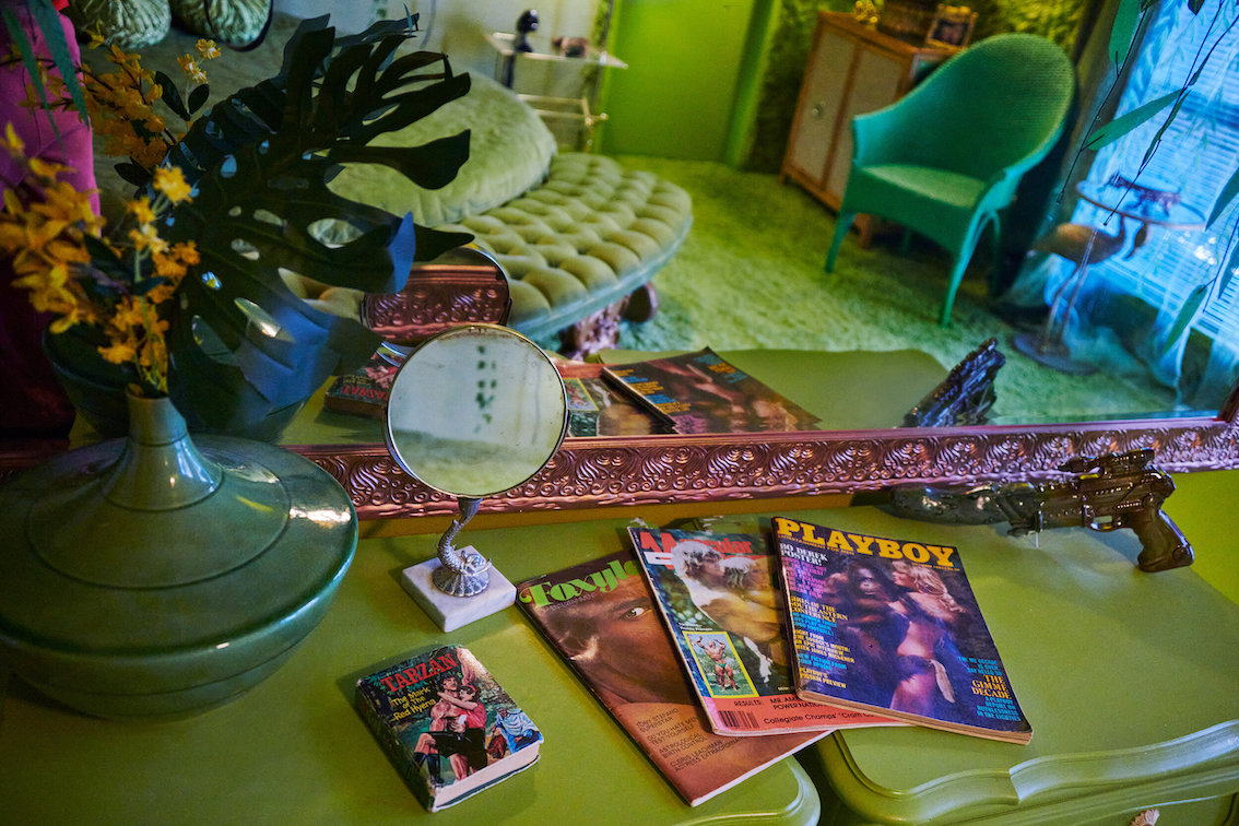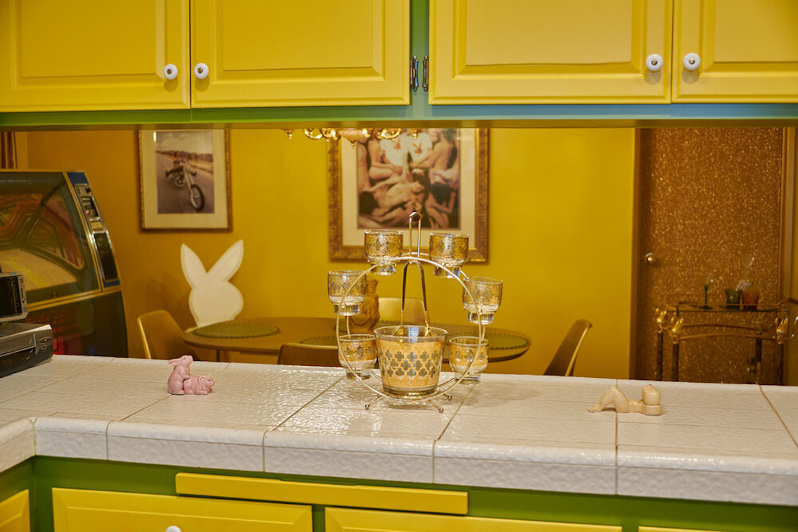 Veel willekeurige vintage rekwisieten door het hele huis. Vintage Playboys, oversized roze knuffeldieren, een verbazingwekkende roze terrasparaplu met franjes, roze badmeubel rekwisieten, vintage maraboe badjas, martini-glazen, roze pillenflesjes, roze faux fur tapijt, kleine Playboy neonverlichting en opblaasbare flamingo's in het zwembad.