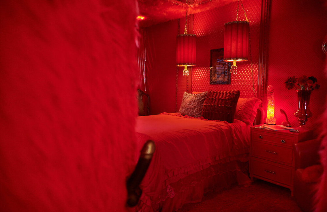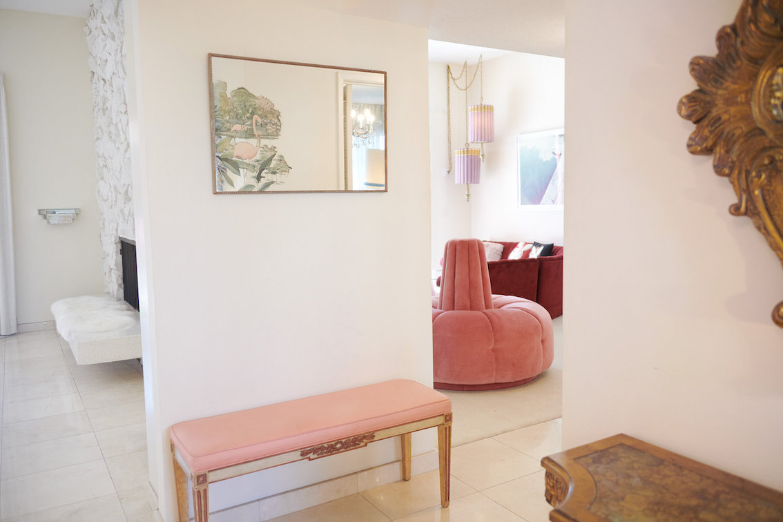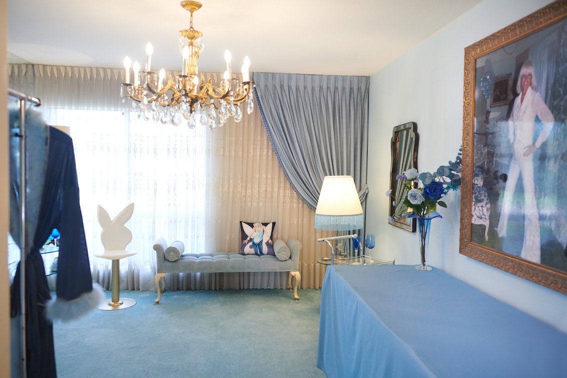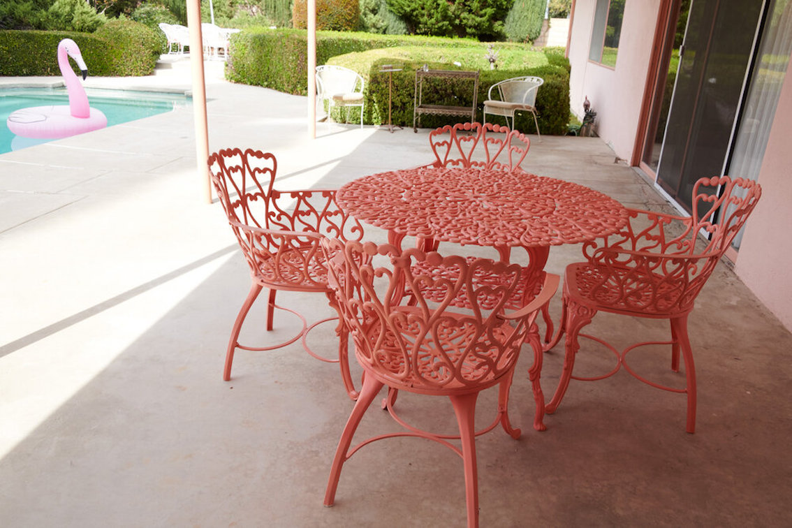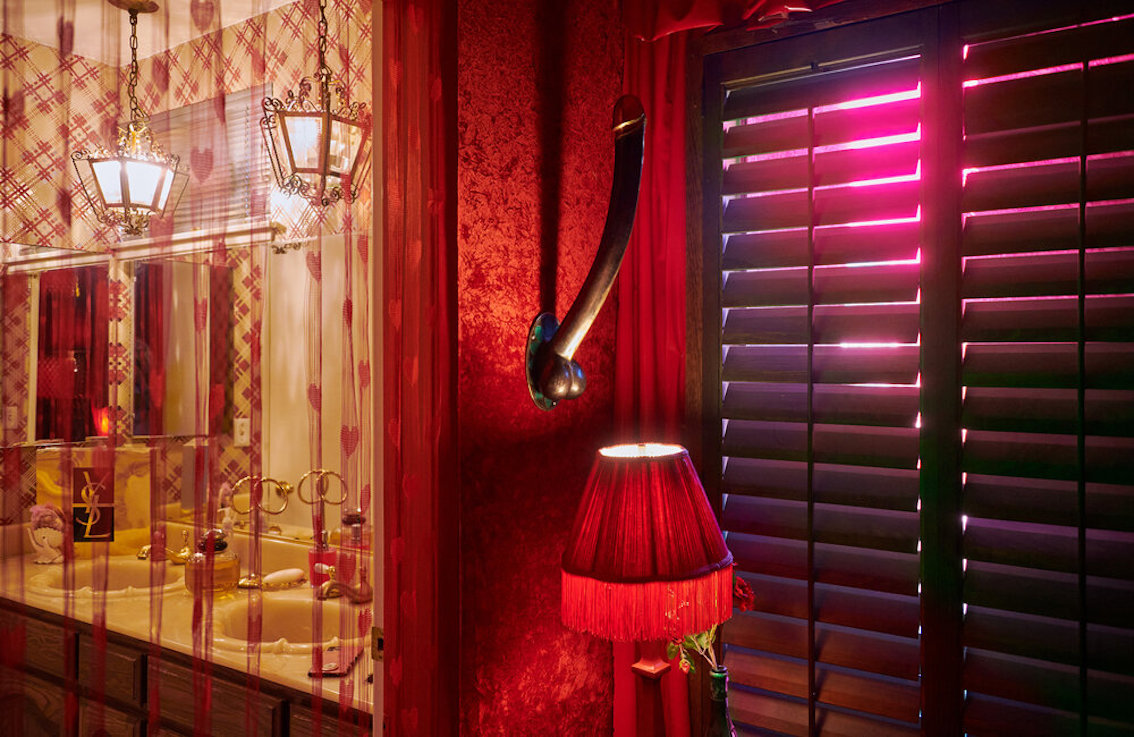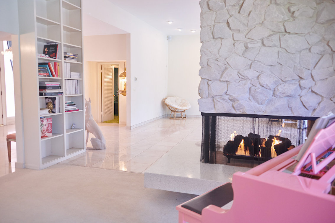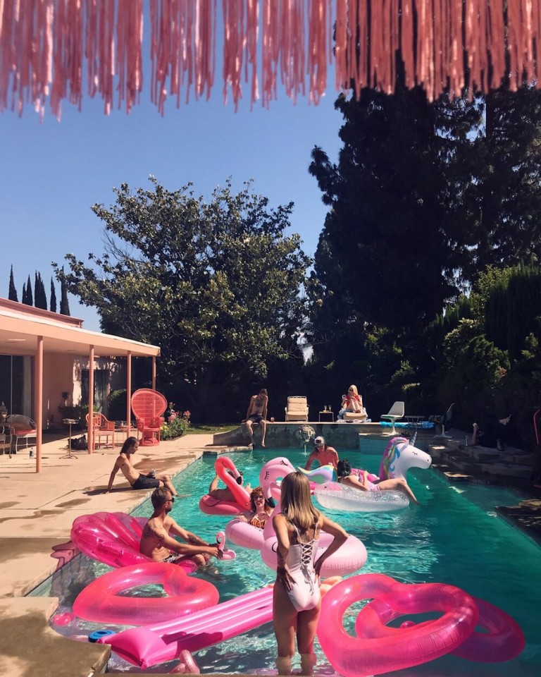 Veel willekeurige vintage rekwisieten door het hele huis. Vintage Playboys, oversized roze knuffeldieren, een verbazingwekkende roze terrasparaplu met franjes, roze badmeubel rekwisieten, vintage maraboe badjas, martini-glazen, roze pillenflesjes, roze faux fur tapijt, kleine Playboy neonverlichting en opblaasbare flamingo's in het zwembad.