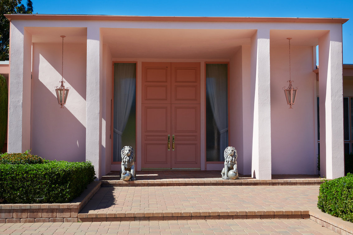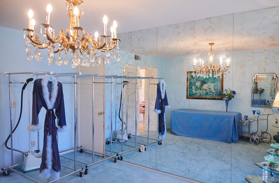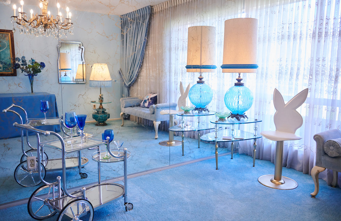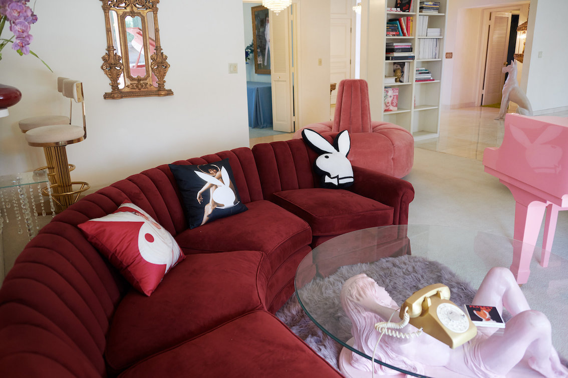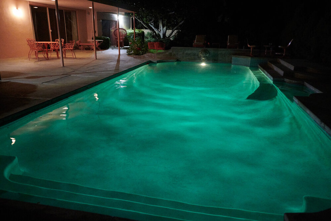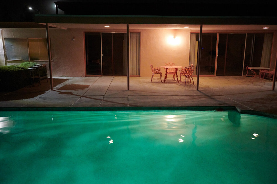 Veel willekeurige vintage rekwisieten door het hele huis. Vintage Playboys, oversized roze knuffeldieren, een verbazingwekkende roze terrasparaplu met franjes, roze badmeubel rekwisieten, vintage maraboe badjas, martini-glazen, roze pillenflesjes, roze faux fur tapijt, kleine Playboy neonverlichting en opblaasbare flamingo's in het zwembad.
