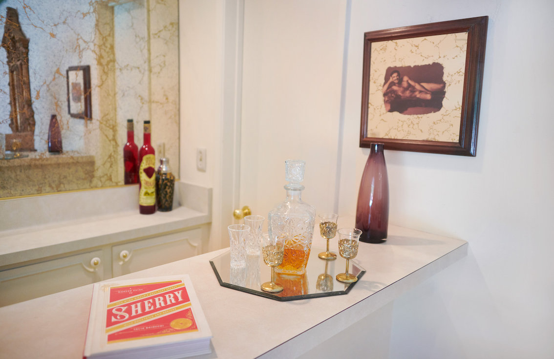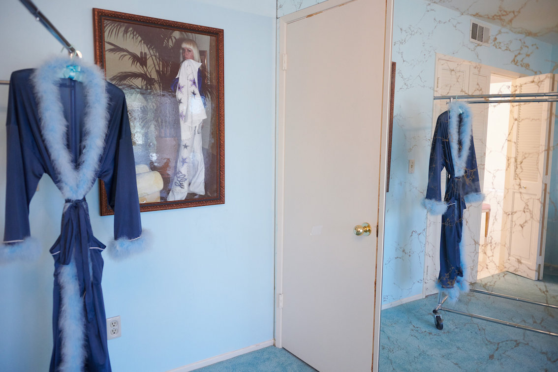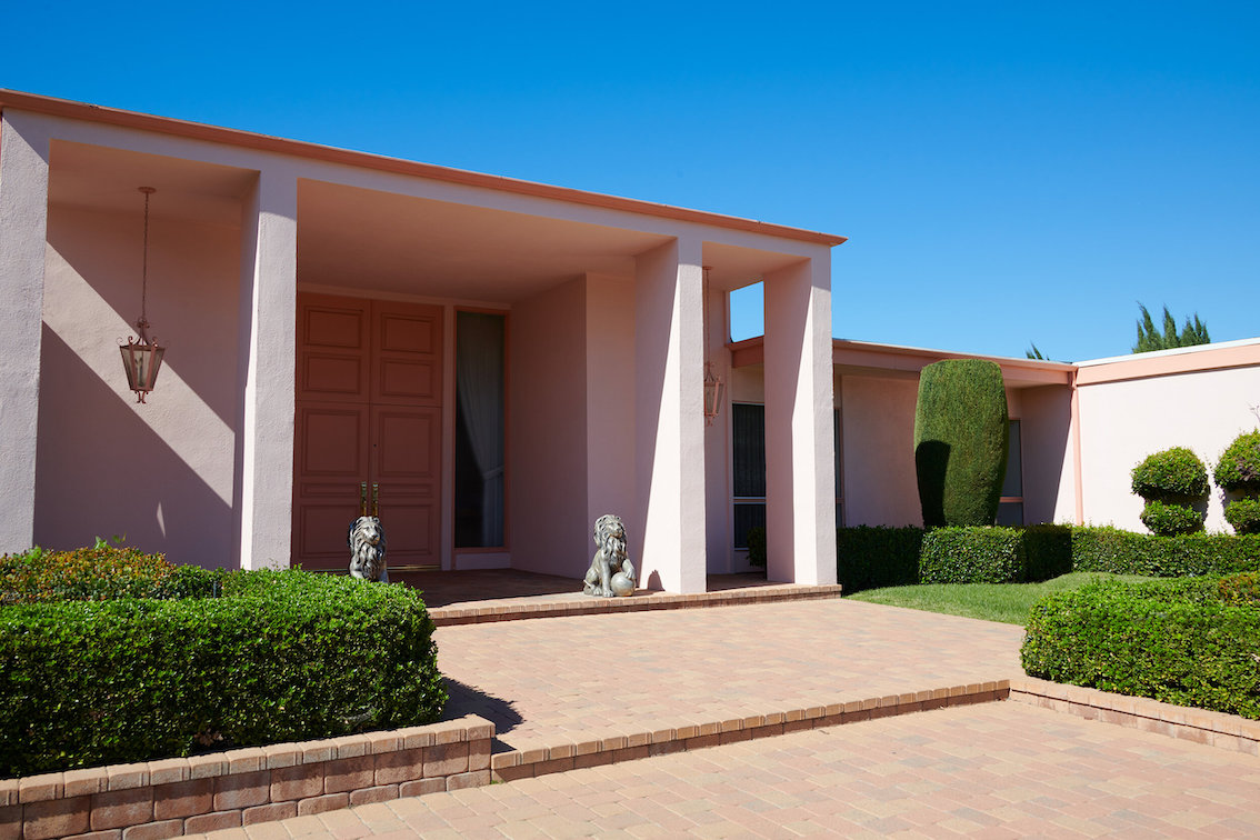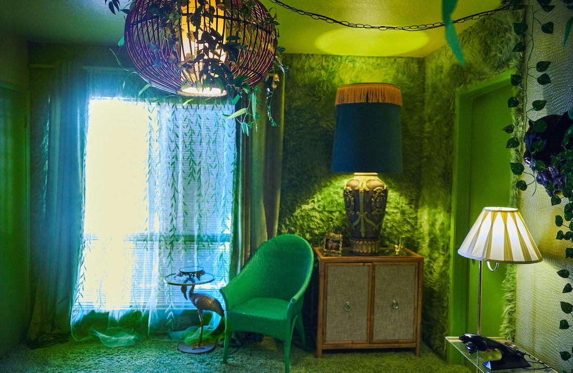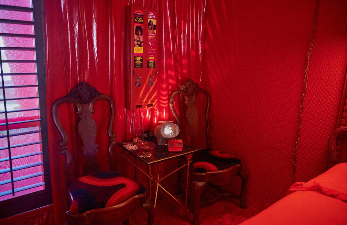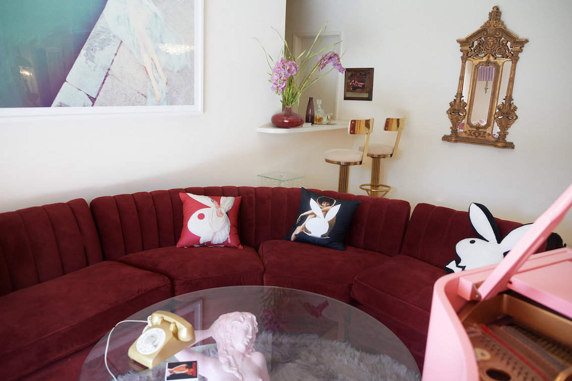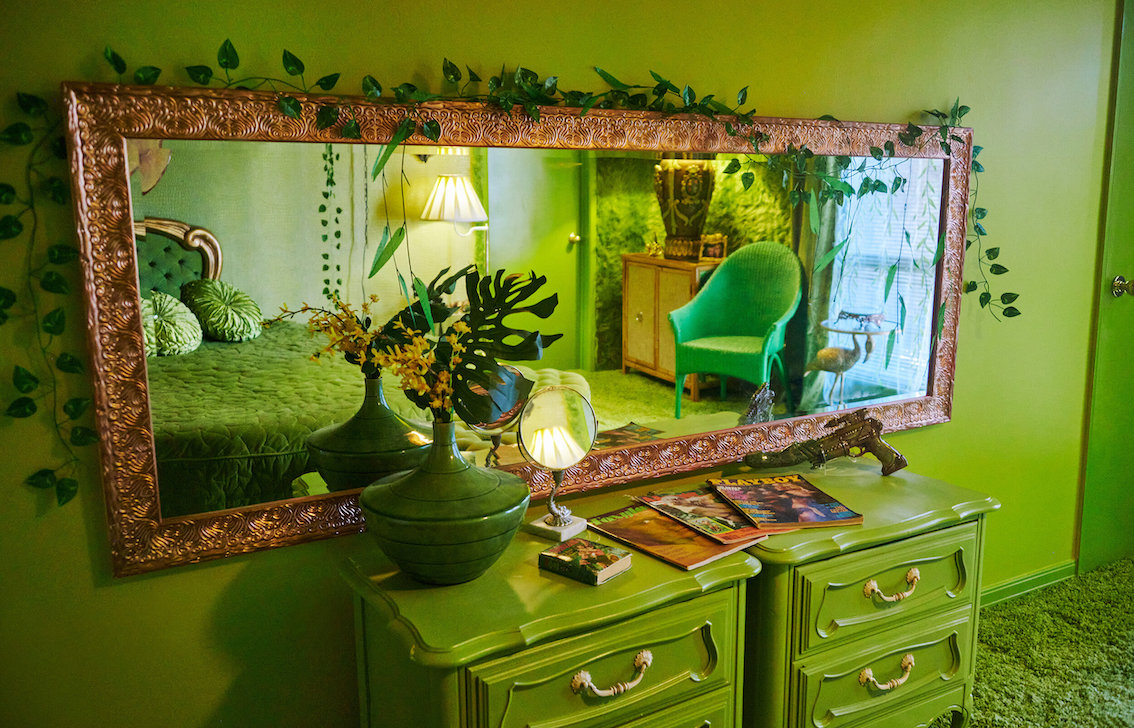 Veel willekeurige vintage rekwisieten door het hele huis. Vintage Playboys, oversized roze knuffeldieren, een verbazingwekkende roze terrasparaplu met franjes, roze badmeubel rekwisieten, vintage maraboe badjas, martini-glazen, roze pillenflesjes, roze faux fur tapijt, kleine Playboy neonverlichting en opblaasbare flamingo's in het zwembad.