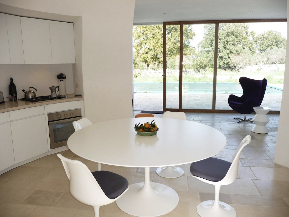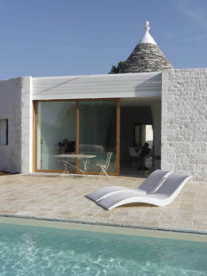 Ontdek de perfecte mix van luxe en geschiedenis in dit prachtige pand, genesteld in een serene woonwijk. Het huis zelf is een wonder van modern design met traditionele invloeden, met een historische stenen gevel versierd met een karakteristiek trullo-dak. Grote ramen werpen helder, natuurlijk licht in de strakke binnenruimtes, waardoor de elegantie binnenshuis samensmelt met de rustige buitenlucht. De ruime woonkamer geeft direct uit op een weelderig zwembad, compleet met ligstoelen en omringd door weelderig groen en dramatische rotsformaties, een schilderachtige omgeving om te ontspannen of gasten te ontvangen.