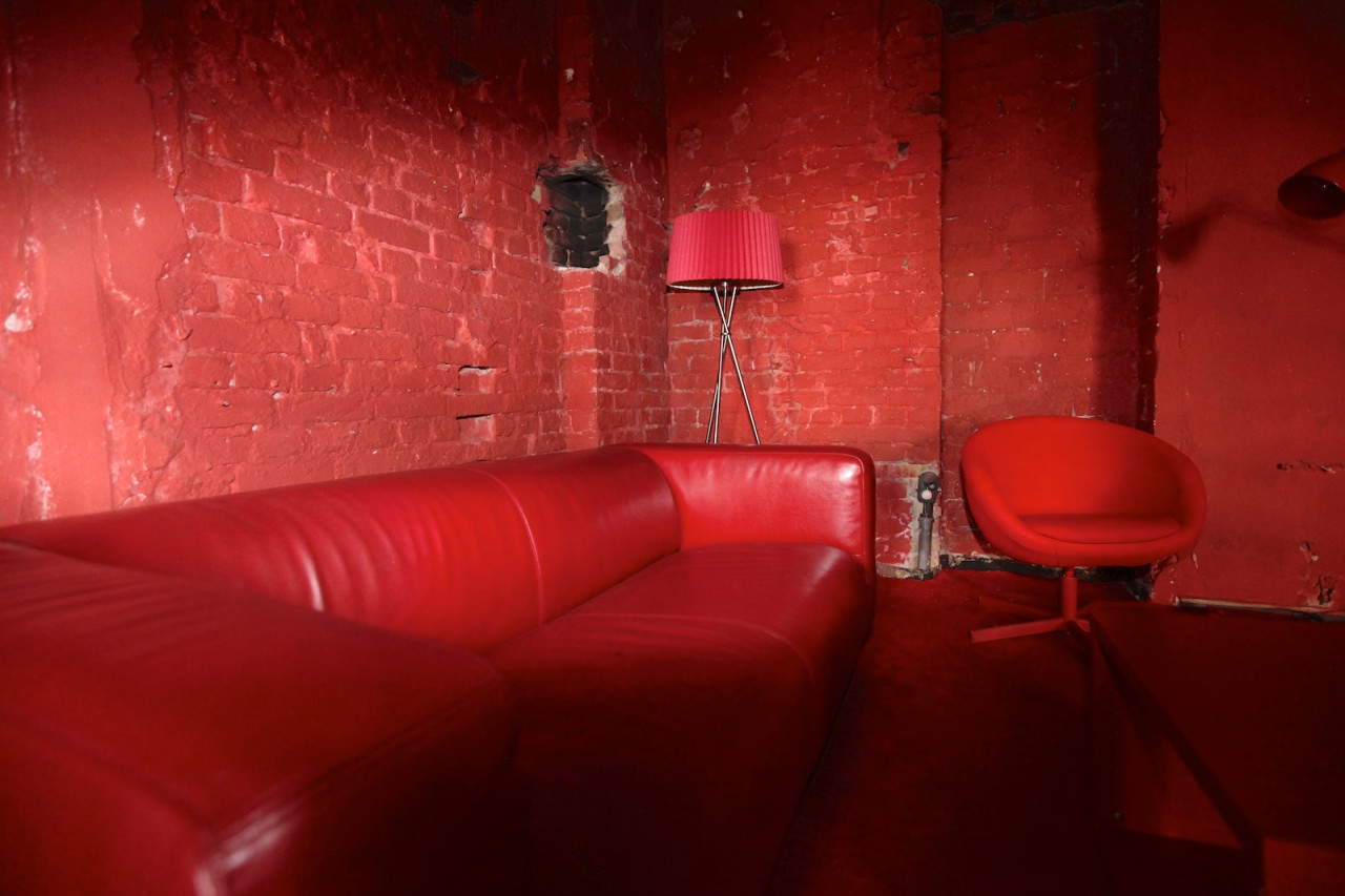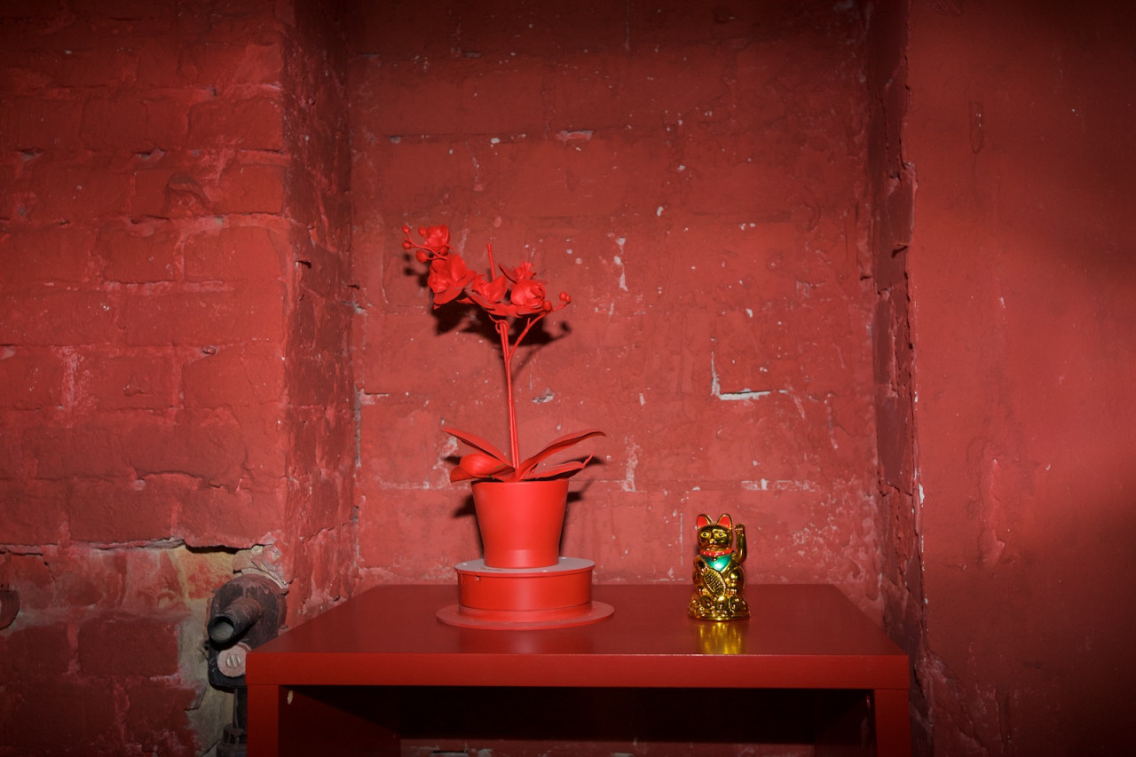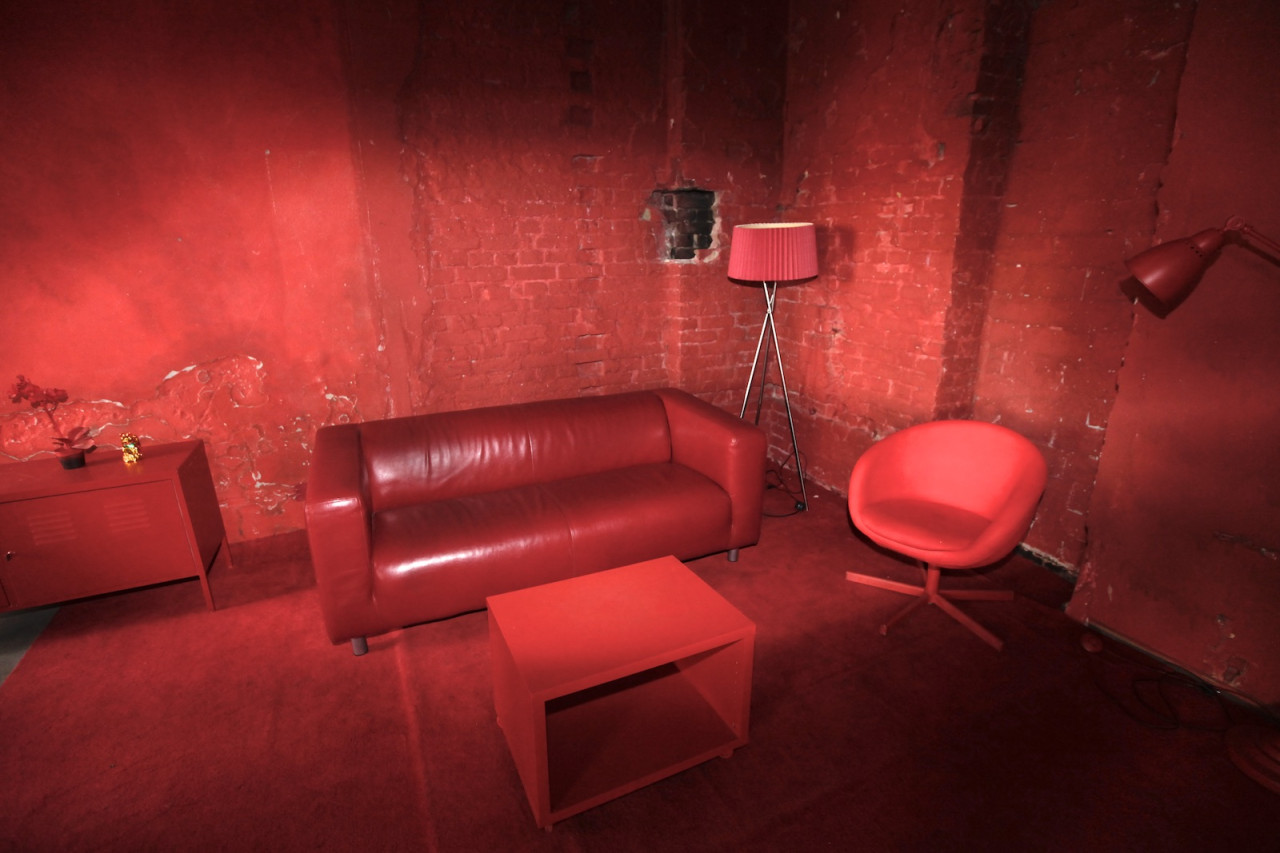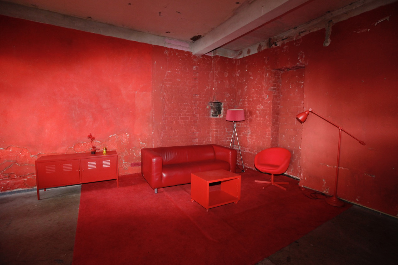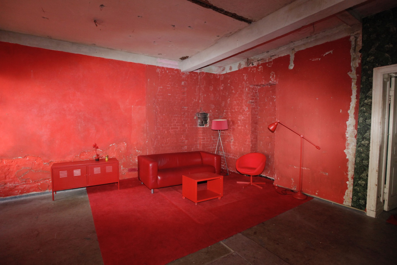 Dit tableau in een hoek met bakstenen muren is knalrood en bestaat uit een schelpstoel, bank, vloerkleed en wat andere accessoires.
