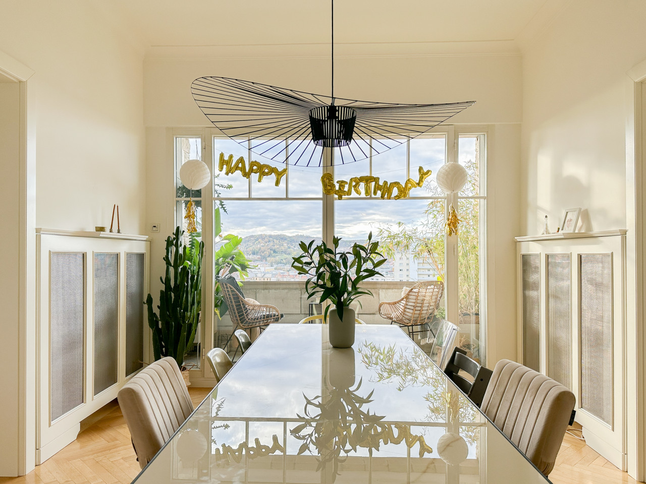 Het interieur is een combinatie van modern en vintage meubilair en creëert een stijlvolle en gezellige sfeer, versterkt door weelderig groen. Klassieke witte dubbele deuren met glazen panelen sluiten aan op een eetkamer, waardoor een open en uitnodigende indeling behouden blijft.